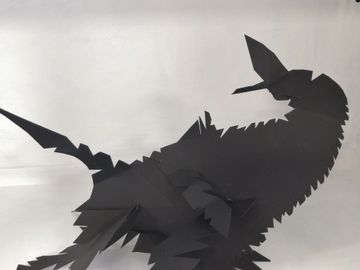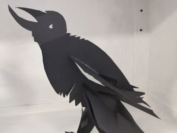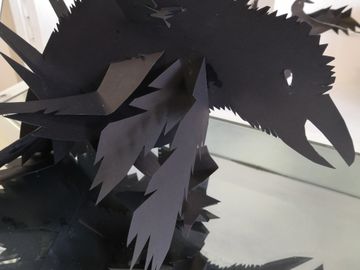 This show features works in paper which were made during lockdown and reflect the experience and atmosphere of isolation and confinement. She has long been fascinated by crows and blackbirds and during lockdown nature started taking back control, animals like wild boar and goats started coming back into urban neighbourhoods. In parks and carparks people witnessed and felt threatened by huge flocks of black birds and crows congregating, resembling large dark clouds. Spikey and jagged black paper crows flock and crowd together. These are not friendly birds, they are noisy and feisty. Crows are seen as symbols of transformation and change, and can be credited with foresight. The artworks are made entirely of paper, using different techniques including slotting, folding and gluing. There are free standing birds as well as a concertina book titled: 4&Twenty with the first lines of the nursery rhyme ‘Sing A Song Of Sixpence’. The birds here are two dimensional and in relief, some are in flight others sit in a tree. The book can be displayed in a linear way or in the round.