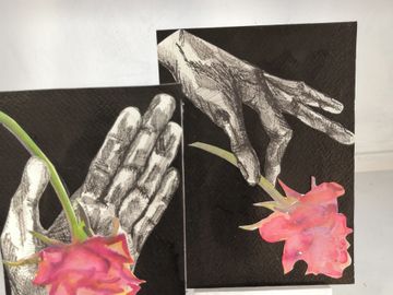 Carefully drawn hands mounted onto black cards hold painted roses, eyes and dried seaweed. The eyes and roses are painted in water colour and the eyes dangle from the finger tips with red thread. (These cards are for sale part of #artistsupportpledge)