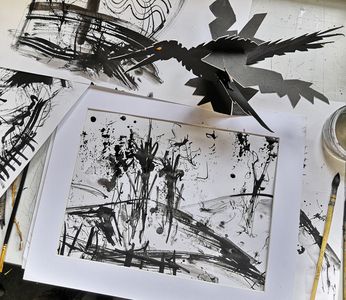 Mark making using black ink and twigs