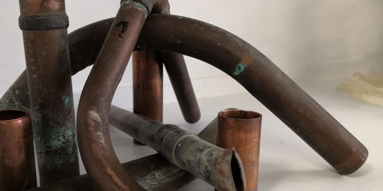 The old shower bathroom pipes showing signs of age, discolouration and rust interlocking and contrasting against the newer pieces of copper. Over time the new will also become old and in a continuous cycle of renovation and regeneration we carry on.