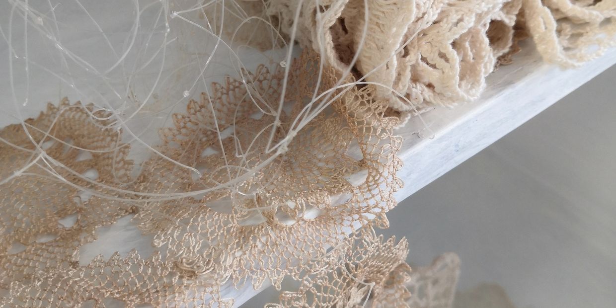Grandmother's old handmade lace intertwined with discarded plastic fishing nets.
