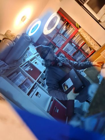 Last week I discovered the orange Ikea chair which we were going to remove and place outside in the courtyard and I thought this could become my centre piece. I could invite people to sit on it and contemplate the space and the work on display. In my view the whole space Junk Space is the art, this space was storage for James' work and every time we pick something up, he has a story to tell. The exquisitely made leather bags and armchairs made by a charity working with drug addiction in Italy, or the gold leaf table that we had to be very careful moving, or the model of the villa he'd designed for this or that millionaire. It was like entering some long lost tomb full of treasures.